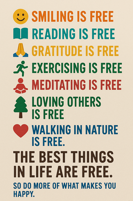 So do more of what makes you happy … especially the things that don’t cost a dime. Smile. Read. Learn. Move. Breathe. Love. Walk barefoot in the grass 🌾. Watch the stars ✨. Laugh until you snort 🤭.